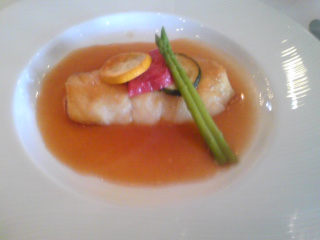 【スズキのオリーヴ油焼き、酸味を加えたジュ】